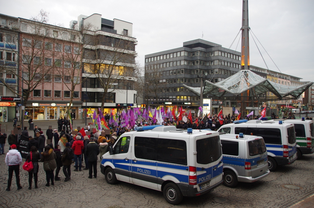 Am 21.3. nahmen circa 500 Menschen an einer Bündnis Demonstration der Initiative “Solidarität mit Afrin Dortmund” teil. Es war einer der größten Mobilisierungen seit dem Angriff durch das türkische Regime auf Afrin. Die Bullen hielten sich verhältnismäßig zurück, obwohl sie natürlich, wie bei jeder kurdisch mitgeprägten Demo mit ihren Muskeln spielten, in dem sie im Vorfeld Fahnen kontrollierte, eine Pferdestaffel einsetze die uns die ganze Zeit über begleitete zusätzlich wurden wir ohne konkreten Anlass mit Handkameras und einer großen Wagenkamera abgefilmt. Als anarchistische Gruppe Dortmund hatten wir gemeinsam mit unseren Freund*innen der Autonomen Antifa 170 und weiteren versucht das antiautoritäre Spektrum zu der Demonstration zu mobilisieren. Das ist uns für die kürze der Zeit und inmitten der Woche auch sehr gut gelungen. Generell gab es auf der Demonstration die größte “deutsche” Linksradikale und anarchistische Beteiligung seit den Angriffen auf Afrin in Dortmund. Am Rande der Demo gab es einzelne Provokationen von Grauen Wölfen, welche Ihr im Video und auf den Fotos bestaunen könnt. Unser Weg führte uns von der Reinoldikirche bis zum großen kurdischen Zentrum an der Bornstraße, wo wir den Abend gemeinsam mit einem großen Newroz Feuer, viel Essen und kulturellem Programm verbrachten. Natürlich wurde auch gemeinsam das Tanzbein geschwungen. Da in unseren Kreisen verhältnismäßig wenig getanzt wird außer vielleicht auf Elektro Partys oder Punk Konzerten. War es dann umso schöner das wir uns dann alle gemeinsam im GovendaKÎ wiederfanden, was für uns ein gelungener und schöner Abschluss des Tages war.