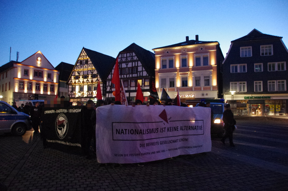 Generell mal ’ne Ansage an die Bullen und vor allem die Panikmacher der Lokalpresse. Was los bei euch? War echt toll wie ihr im Vorfeld rumgeheult habt, dass Unna das Armageddon bevorstehen würde. Dass der G20-Hamburg-Vergleich nicht gekommen ist, ist das einzige, was uns überrascht hat. Was ist passiert? Nix außer dass alles mit Bullen zugeschissen war und unsere 80 Menschendemo in einem Spalier gelaufen ist. Dabei wäre genau das herbei phantasierte Armageddon das einzige, was den Faschist*innen wirklich mal Steine in den Weg legen würde. Was wäre den wenn es eben mal nicht ruhig bleiben würde? Wenn die Nazis ihre Kundgebung nicht durchführen könnten und sie verhindert würde? Dann wären zwar eure „Demokratischen Werte“ verletzt, die ohnehin sehr dehnbar sind, aber die Faschos würden nicht mehr so schnell nach Unna kommen. Was sie auch hoffentlich so nicht tun werden. Immerhin ist es für sie jetzt schon nicht leicht, in der Stadt Zuspruch zu finden.